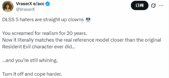 不过,也有玩家对DLSS 5持支持态度。博主VraserX就直言:“那些喷DLSS 5的人简直离谱。你们喊了20年要更真实的画面,现在它已经比原版角色更接近真实模特了,结果还是在抱怨。不喜欢就关掉自己适应吧。”