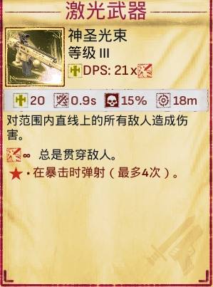 武器推荐推荐玩家带坚盾循环和神圣光束两把武器搭配使用,可以2把坚盾循环3把神圣光束。清怪和输出能力都比较强大。
