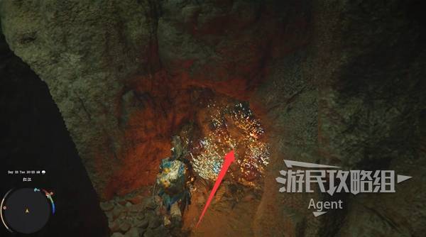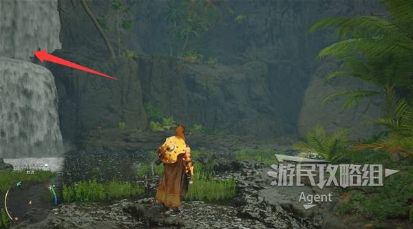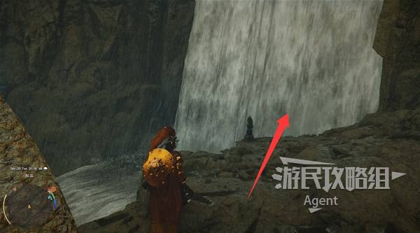 瀑布右边有个大石块,进入缝隙到石块后面,用技能"劲法:凝神"打碎彩色石头,进去开宝箱拿到【金色欲望板金鞋子】。