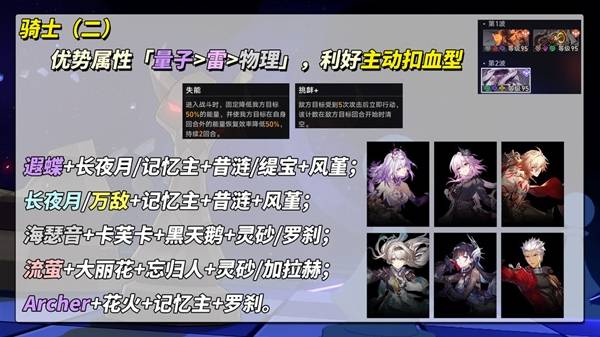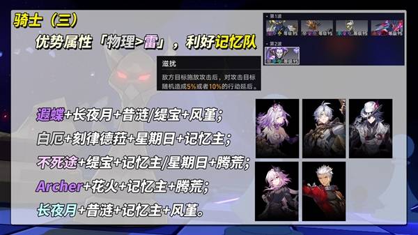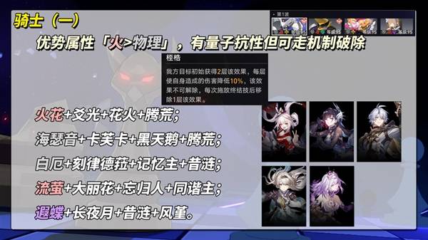 骑士(一)优势属性「火>物理」,敌方存在量子抗性,但可高速量子队可解除此效果。关卡负面"开局2层10%伤害降低,每次施放终结技减少1层"。