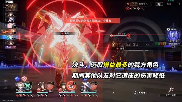 第1波,集火"黑日狮鹫",它会召唤小怪,击杀召唤者,小怪会同步消失。对局中"黑潮斗将"会在2次行动后,主动拉增益最多的角色进入单挑(非单挑角色对它造成的伤害降低),期间可通过攻击叠加士气提高伤害。