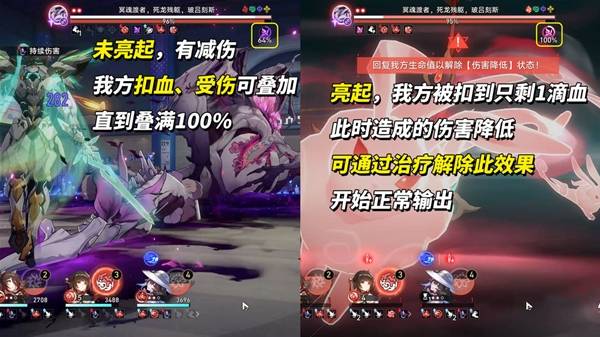 第2波BOSS死龙,初始拥有高额减伤,需通过降低生命值(含受击)积攒敌方血条下的充能条。满100%后死龙立即行动扣除全体生命值到1滴血,此时需通过恢复生命值解除伤害降低效果,开始正常输出。