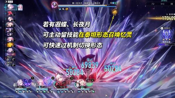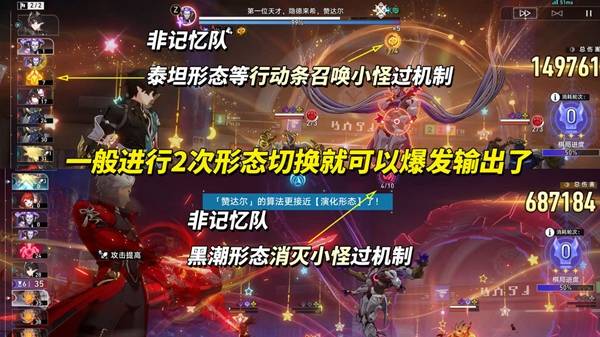在无长夜月或遐蝶的情况下,在前2次变身尽量走机制,从第3次开始全力输出BOSS。泰坦形态,等待行动条召唤2次小怪;黑潮形态,击杀10个小怪。注意,每次切换黑潮形态时把全角色终结技用了,避免被它双拉条激活终结技时浪费。