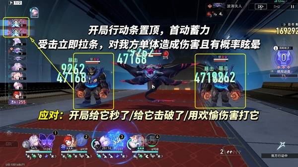 第1波非欢愉队,则优先集火"民用机铠",尽可能减少它行动机会,有概率眩晕角色。若你欢愉队,则集火"波涛夫人",中途"民用机铠"蓄力时用欢愉伤害打它,可使其攻击旁边敌方单位。