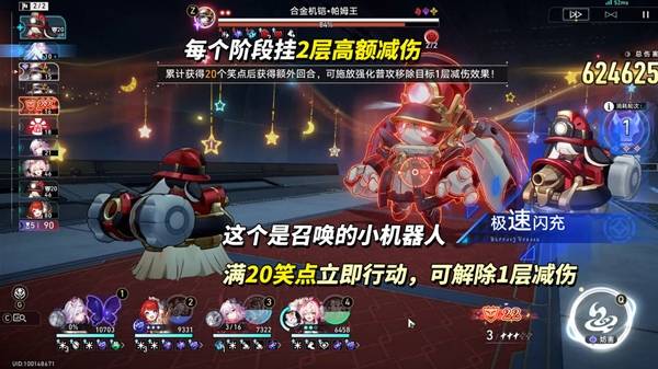 第2波"帕姆王"机制很纯粹,每个阶段都会给自己添加2层减伤效果,此时会给我方召唤1个合金帕姆,累积20笑点时立即行动降低1层帕姆王减伤。