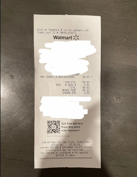 近日,一位网友在Reddit PC社区分享了自己的捡漏经历:他在沃尔玛清仓中以仅80美元(约合人民币552元)入手了一块微星RTX 5060 Ti 8GB显卡。