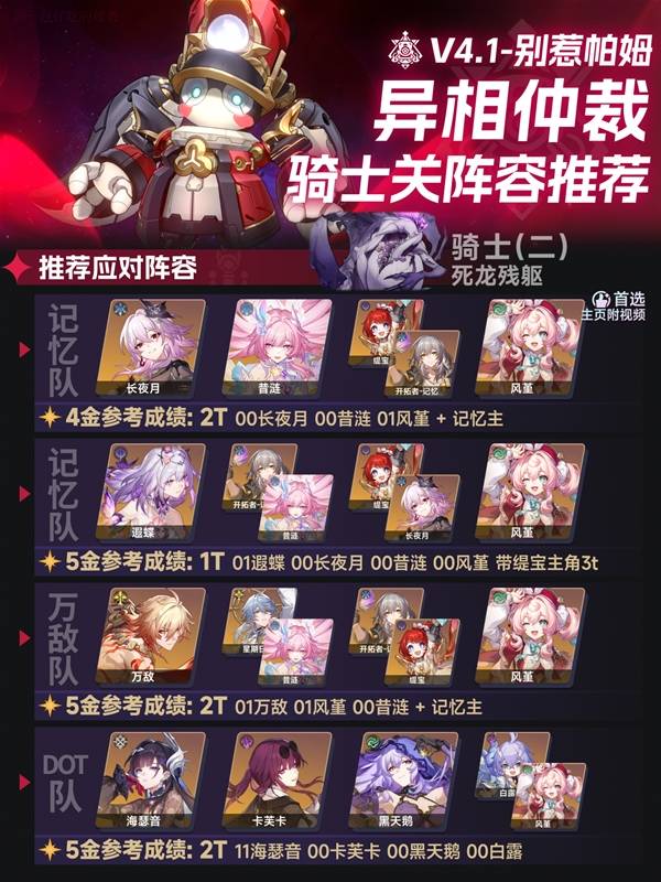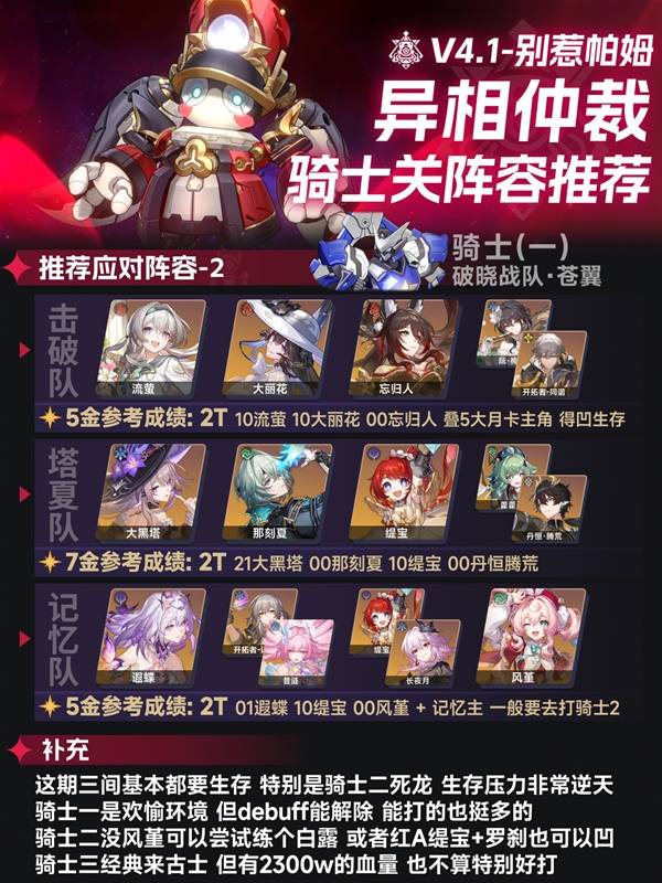 崩坏星穹铁道4.1版本的异相仲裁已经更新,那么三个骑士关要怎么搭配阵容呢?下面请看由"一包好吃的辣条"带来的崩坏星穹铁道4.1异相仲裁骑三骑士关阵容推荐,一起来看看吧。