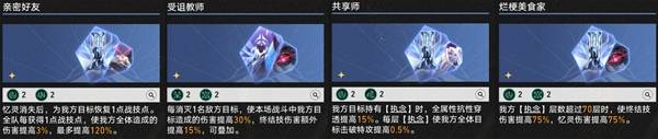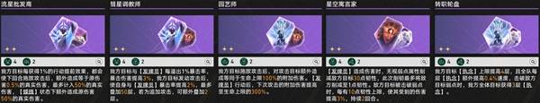 二星方程方面,【流星批发商】可为死龙提供稳定的真伤增益;【彗星调教师】可提供暴击伤害加成;【园艺师】可提供额外附伤;【星空寓言家】可提供易伤加成,【转职轮盘】可提升全队速度,并以此提升风堇治疗效率,加快队伍循环。