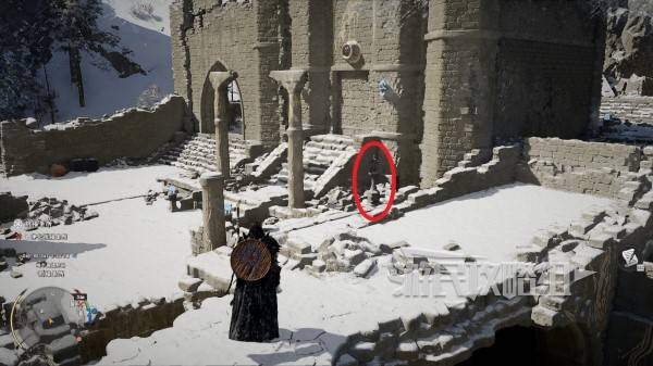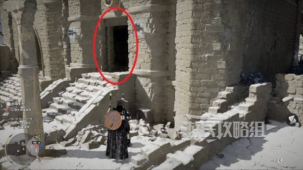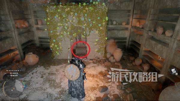 解放圣所或绕开敌人后,参考下图所示位置,在之前有一堆敌人聚集的小广场上,两根石柱旁边的墙角处有个石灯笼,互动将其点燃打开墙上的暗门,进入暗门开启里面的宝箱即可获得失落王国的皮制头盔。