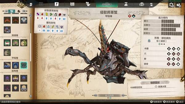 侵兽镰蟹总血量大约有10000HP,背部部位的耐久大约是1700左右。带着背壳时,包括雷系伤害都十分有抗性,但仅有无属性伤害是没有抗性的。