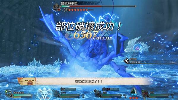 在第二回合时,切青电主使用电磁炮S,攻击侵兽镰蟹背部部位。同样只要上面咱的要求都达成了,能造成2900+~6000+的伤害(根据是否暴击、DEBUFF、有无猜拳等有差别),咱最高爆出来9999伤害上限完成成就,咱都不知道是怎么机缘巧合爆出来的。同样只要达到输出1700+以上就能让侵兽镰蟹的背部部位被破坏进入倒地模式。