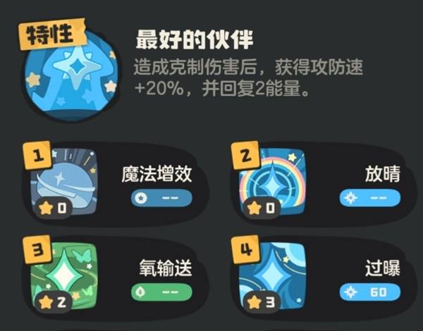 氧输送,个人认为这是迪莫核心的一个技能 2点能耗恢复4点 净赚2点 并且还能提供70%的魔攻加成 技能是获取也非常简单,捕捉一只奇丽花使用两次氧输送就能获得技能石。