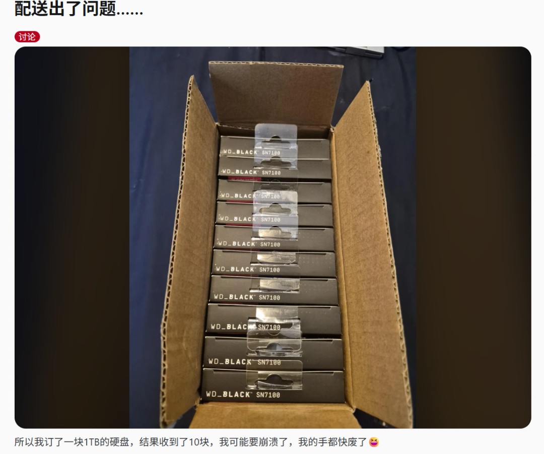 Reddit上有用户"Bat-Dragon-666"发帖称,自己订购了一块1TB西数SN7100 NVMe固态硬盘,结果到货时盒子里却装了10块。帖子附带一张照片,显示10块相同的固态硬盘整齐地排列在包装盒内。