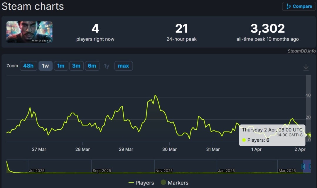 Gerhard声称游戏销量"几乎每周翻倍"。但根据SteamDB的实时数据,该游戏同时在线玩家数仅为个位数,24小时峰值也仅有21人。有评论调侃称,如果某一周仅售出1份,下一周售出2份,从百分比上看确实实现了100%的增长。