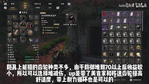 头盔我带了一个旋风斩,伤害提升。防具上能插的齿轮种类不多,由于防御堆到七十以上后收益较小,所以可以选择堆减伤我是带了美食加和移速齿轮提高舒适度,戴上耐力循环也是可以的。