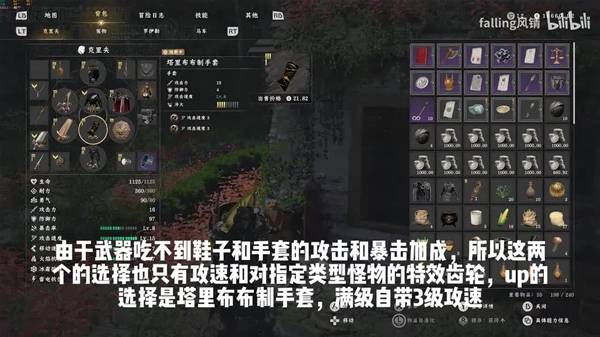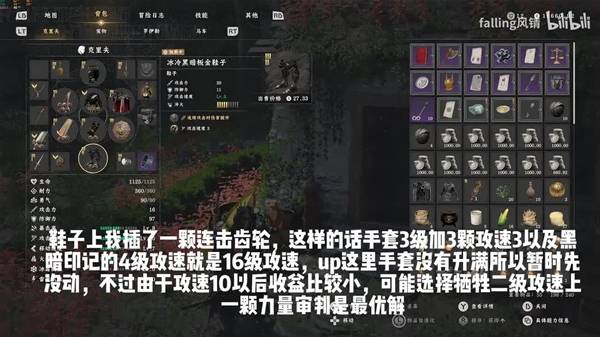 由于武器吃不到鞋子和手套的攻击和暴击加成,所以这两个的选择也只有攻速和对指定类型怪物的特效。齿轮我的选择是塔里布布制手套,满级自带三级攻速,鞋子上我插了一颗连击齿轮,这样的话手套三级加三颗攻速三以及黑暗印记的四级攻速就是十六级攻速。