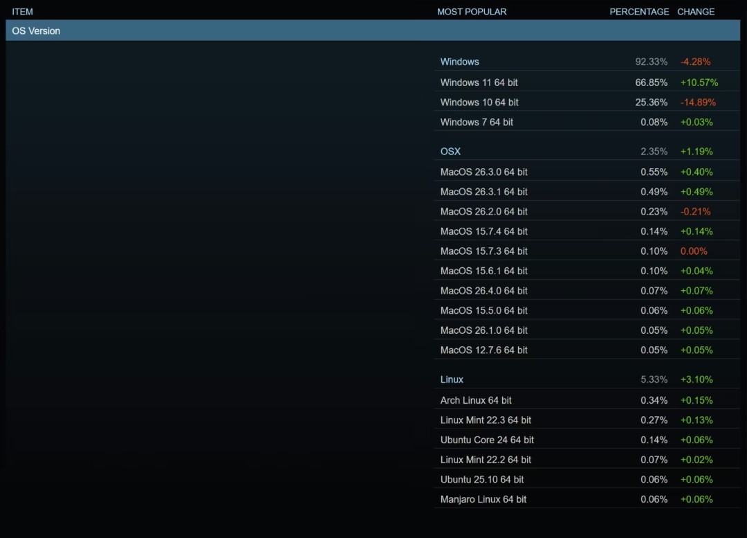 这部分流失的用户,主要被另外两大阵营分走。其中macOS增长了1.19%,表现算是中规中矩;反倒是Linux的提升更让人意外,单月上涨约3.10%,直接把整体份额推到了5.33%,首次在Steam平台站上5%这道门槛。