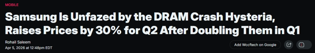 据外媒报道,韩国半导体巨头三星2026年Q2将再次内存提价30% ,要知道刚刚过去的QI已经较去年同期翻倍。
