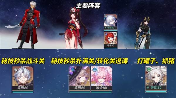 我们主玩的阵容为"Archer+花火+爻光/缇宝+腾荒",由于差分宇宙给了3.8版本前的角色试用,不必纠结缺角色怎么办这种问题,用就完事了,主要靠BUFF给数值,角色本体练度影响有限,充当机制发射器。