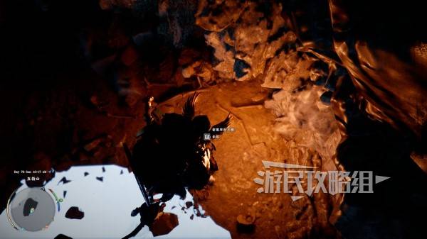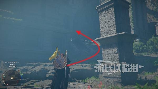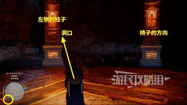 然后保持这个面向,稍微往左转视角到偏左的柱子处,往柱子后方的岩壁上看,可以看到一个洞口。可以参考下图中左下角小地图上,传送点标记的位置。