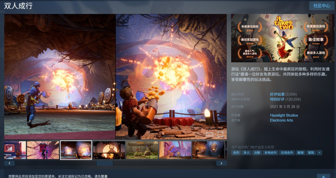 可以看到以上三款游戏发售时间间隔在3-4年左右,而获得TGA 2021年度游戏的双人成行销量最好,成功突破了3000万。