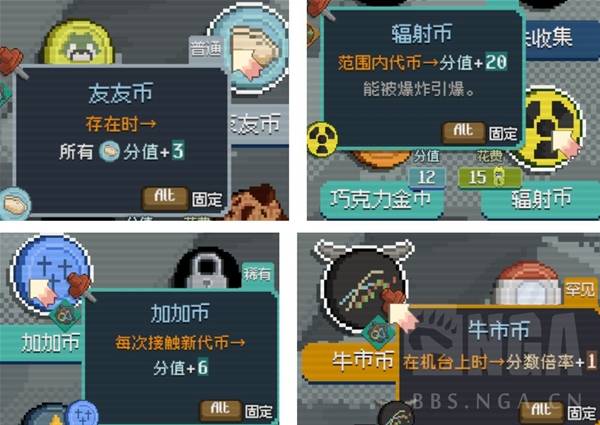 比较有特色的是"坏币",就是在台面就有DEBUFF的币,可能是分数减半这样非常离谱的效果,约等于小丑牌的BOSS关卡,最好确保你的手里有类似[杀手币]这样针对性措施。