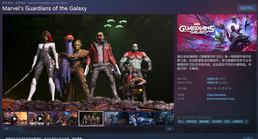 漫威银河护卫队最初于2021年10月26日发售,登陆了PC(Steam、Epic),PS4,PS5,Xbox Series,Xbox One和Switch平台。不过Switch版只是云版本。