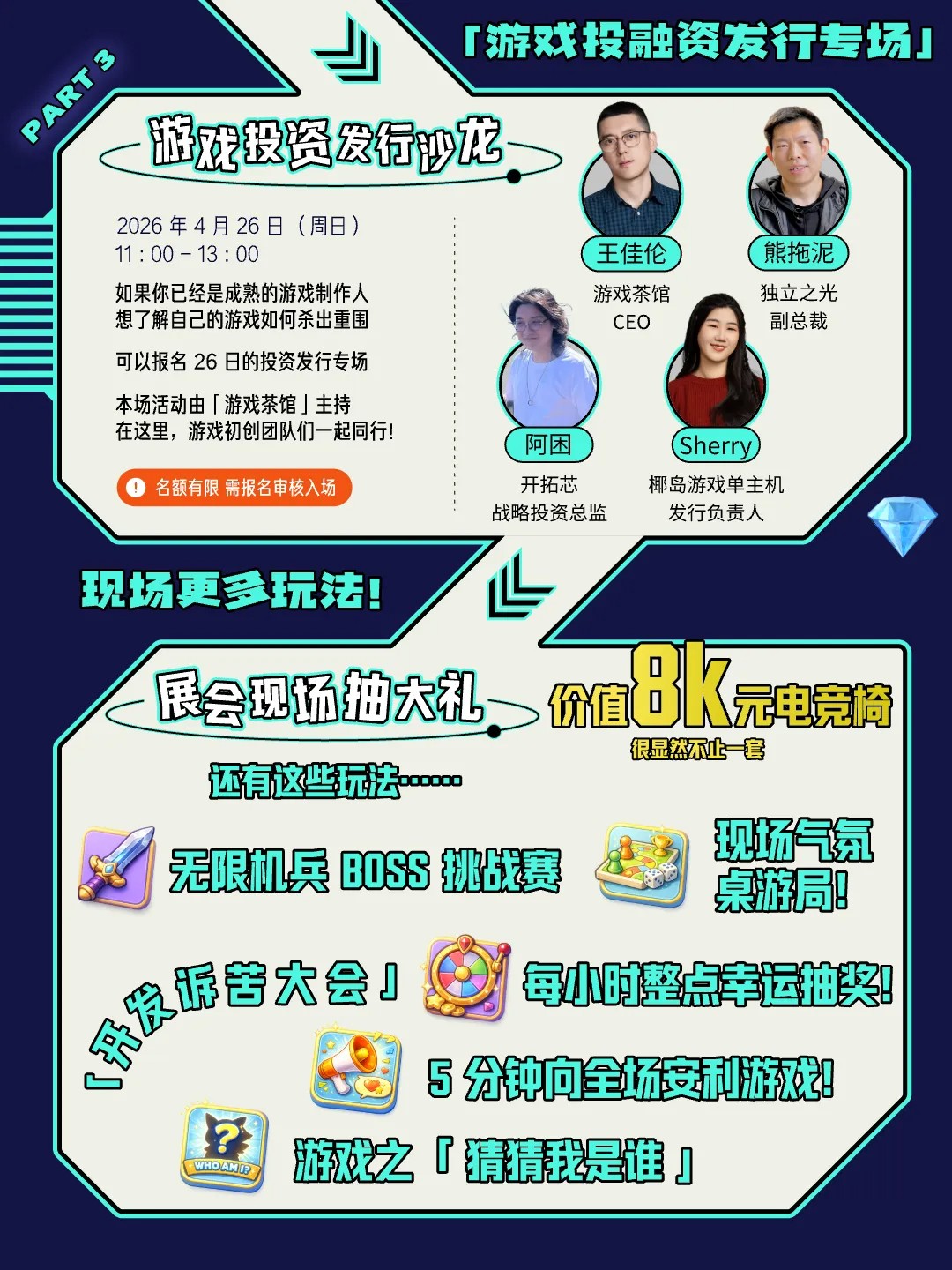 本次活动特别设立@游戏茶馆 投融资路演板块,旨在精准破解游戏团队的融资痛点。将公开招募严选 8 款潜力产品进行现场路演,定向邀请数十家顶级投资机构参与,构建从产品展示、资方对接到深度洽谈的一站式对接平台。