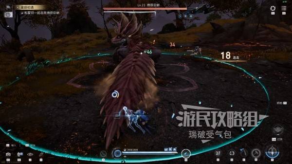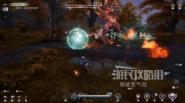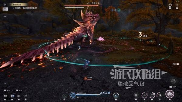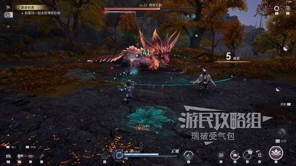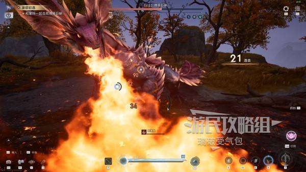 燎原巨蜥会时不时朝面向前方扇形区域喷火,还会用尾巴多次向角色所在位置拍地,可以通过连续完美闪避躲开。