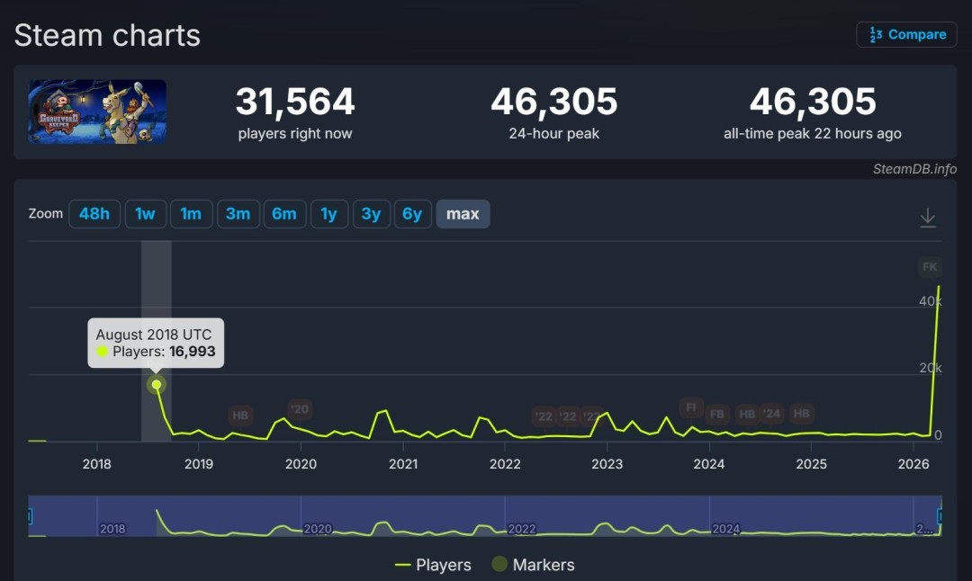在免费领取期间,守墓人于4月12日晚在Steam创下46305人的历史最高同时在线玩家记录,几乎是2018年首发峰值的三倍,远超日均2000人的常态水平。