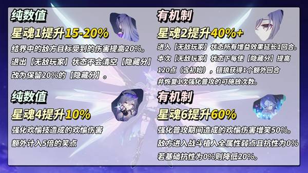 「机制」星魂6提升60%+。强化普攻期间增笑50%,类似独立乘区。敌方进入战斗后植入全弱点,全属性弱点抗性降低为0%,若基础为0%则改为降低20%。