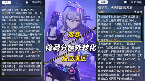 配队推荐银狼拥有【隐藏分转双暴与独立乘区】的机制。每1点隐藏分提高0.4%暴击率,满暴则变为0.8%暴击伤害;每60点隐藏分强化普攻伤害提高为原本115%,至多2层提高为130%。