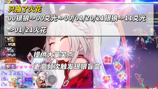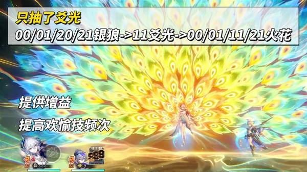 ③只抽了火花。可考虑先抽个00银狼,并预留1金等待未来爻光复刻抽其本体,现阶段先"银狼+火花+欢愉主+藿藿"。00银狼->00爻光->00/01/20/21银狼->11爻光->01/21火花。