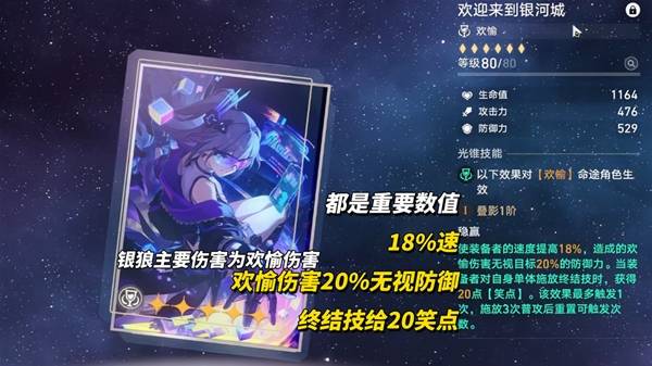 ※18%速、欢愉伤害20%无视防御、施放终结技20笑点。