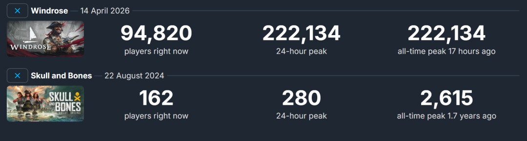 根据SteamDB显示,风启之旅在PC Steam上的同时在线峰值为22万2134人,而2024年8月推出的碧海黑帆其在线峰值只有2615人。简单计算,风启之旅在线峰值大约是碧海黑帆的85倍。当然,碧海黑帆当初登陆了多个平台,即使加上育碧自家PC平台以及主机,充其量也不会太多。