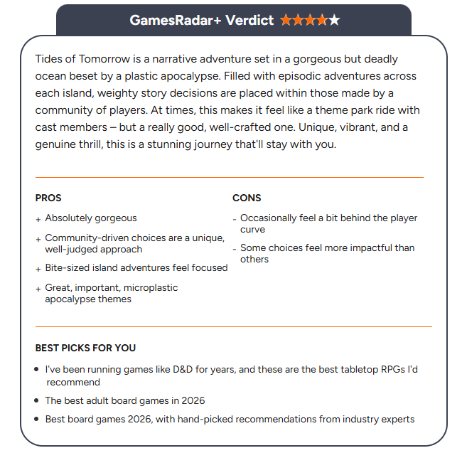 我穿梭于各个岛屿之间那条曲折的路线,如今感觉像是属于我自己的一场冒险。虽然我并不想重玩一遍来覆盖掉这段个人故事,但如果我看到有人在考虑入手这款游戏,我一定会推荐他们立刻跳进来。明日潮汐将玩家群体的决策混合在一起的独特手法,让这款选择驱动的叙事冒险游戏始终保持新鲜感,而那个致命又色彩斑斓的末日世界,让我根本无法移开视线。如果你热爱以故事为核心的游戏,并且喜欢权衡艰难的抉择,那你简直应该--怎么说呢--昨天就玩上明日潮汐。