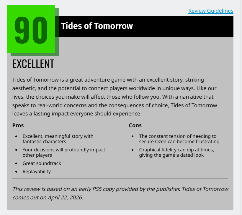 明日潮汐并非完美无瑕,但它确实足够特别。尽管叙事基调阴郁,这个世界依然引人入胜、美丽动人。故事讲述令人难以置信,角色塑造也十分出色。看到如此广泛的决策选择如何与整个游戏机制协同运作,着实令人印象深刻。仅仅因为它能促使玩家之间产生真实的人际连接这一点,也值得关注。无论是故事、玩法还是它所传递的信息,我都鼓励每个人都至少通关一次。