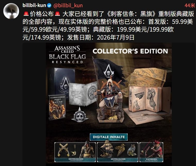 今日,可靠内部人士兼数据挖掘者billbil-kun分享了即将推出的刺客信条:黑旗重制版Resynced的定价信息。
