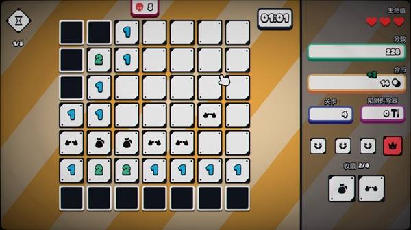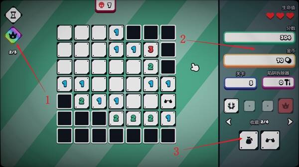 本作在传统扫雷基础上加入了肉鸽玩法,下图就是该游戏关卡界面。