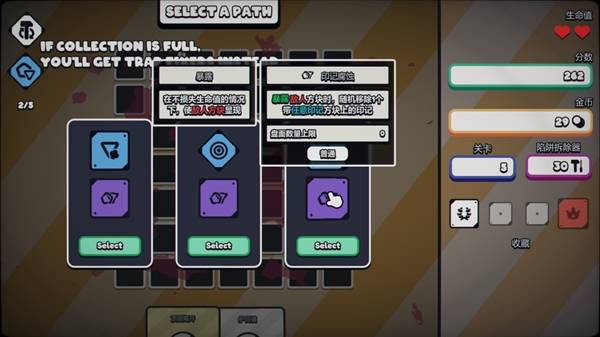 BOSS通关后会出现三选一选择,每个选择会有一个奖励卡牌和一个陷阱卡牌,玩家可以选择一个最合适的进行游玩。
