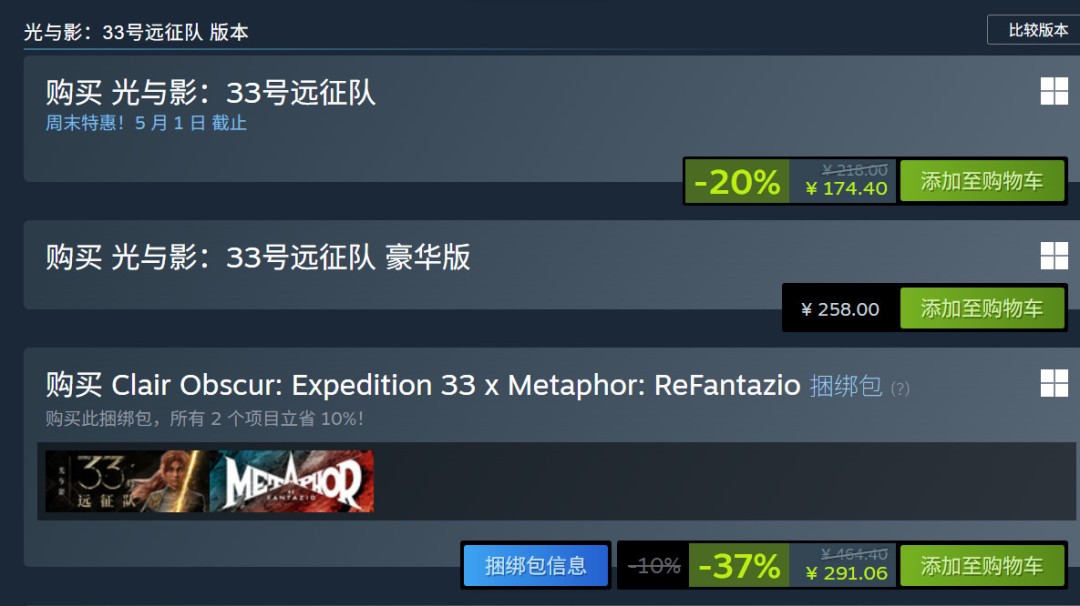光与影:33号远征队标准版当前正在Steam平台8折促销,原价218元,现价174元,此次促销截止到5月1日。