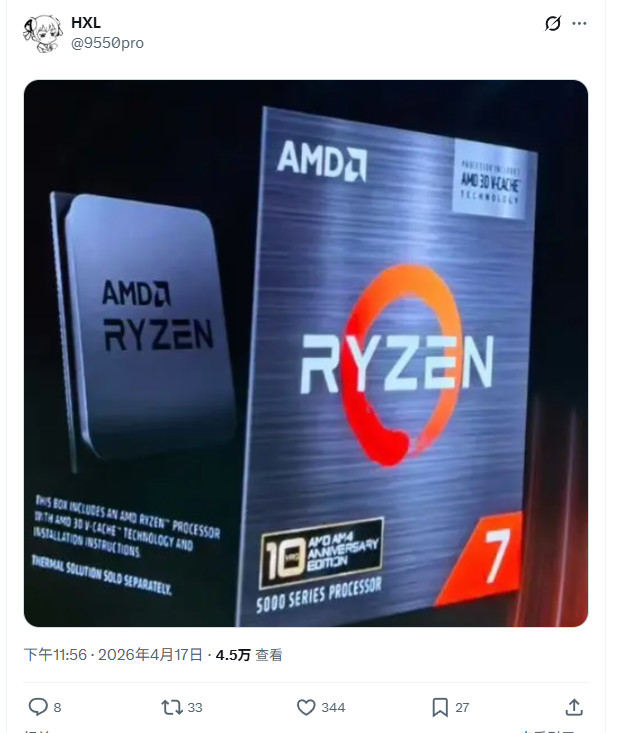 AM4最后的荣光!锐龙7 5800X3D十周年纪念版现身